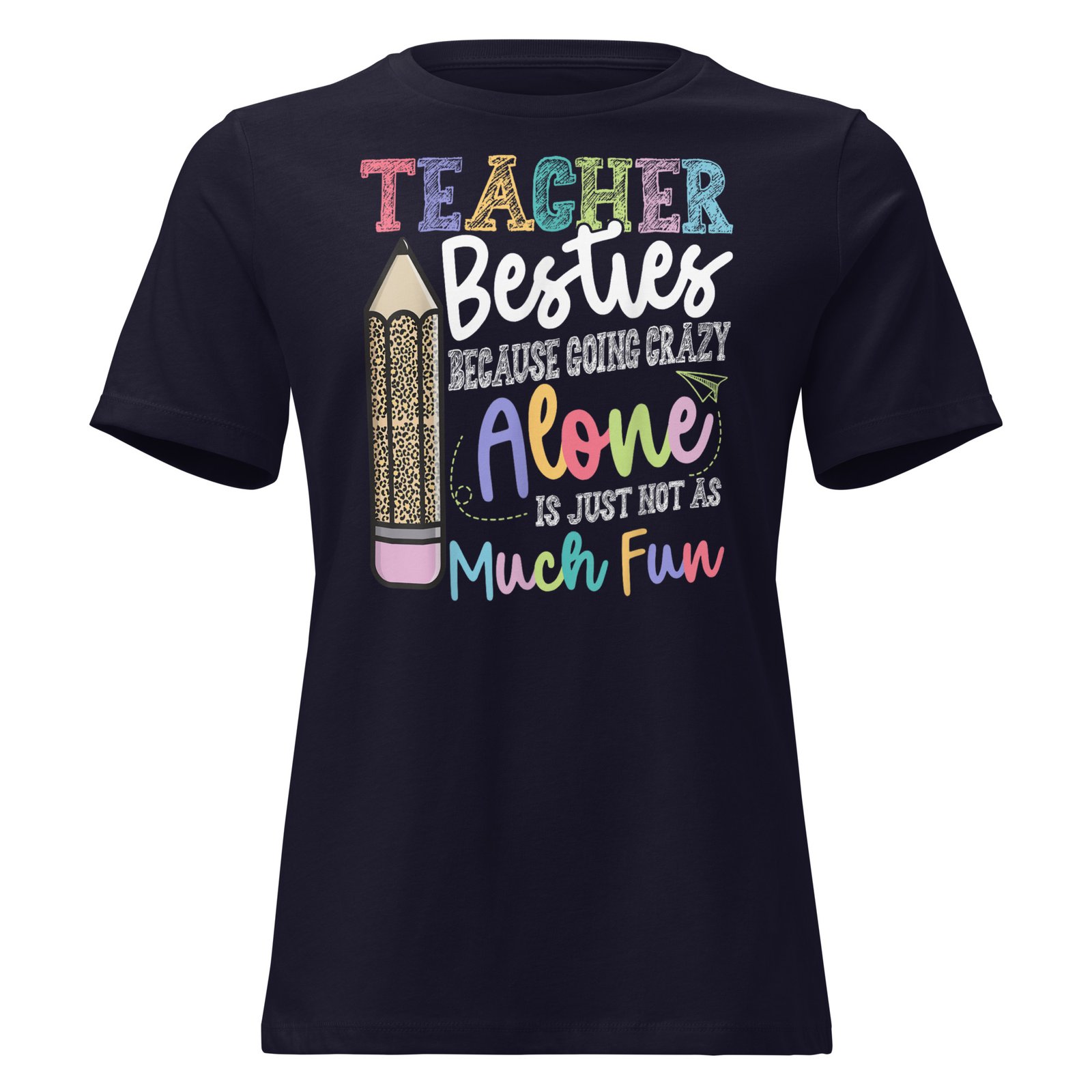 Celebrate your friendship with fellow teachers in this fun “Teacher Besties Because Going Crazy Alone Is Not As Much Fun” T-Shirt! Ideal for casual days at school, staff gatherings, or just hanging out, it’s a great gift for those who embrace the teaching journey together!