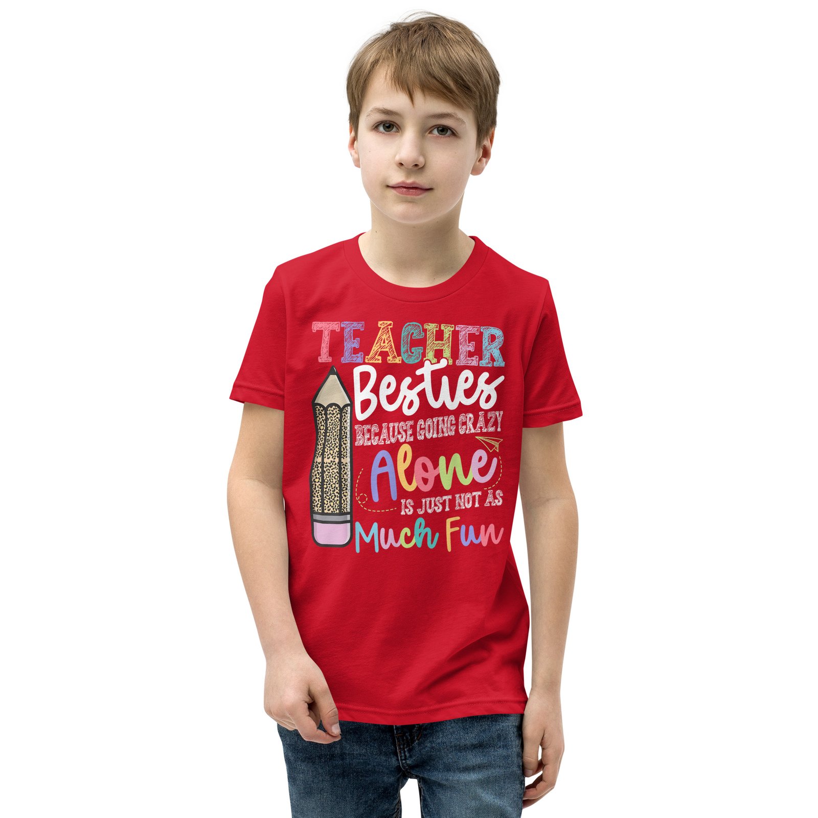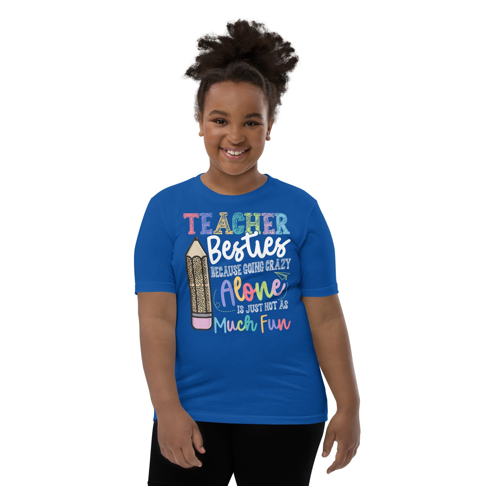 Show off your bond with fellow educators in this playful “Teacher Besties Because Going Crazy Alone Is Not As Much Fun” T-Shirt! Perfect for school events, teacher appreciation days, or casual outings, it’s a fantastic gift for friends who navigate the teaching adventure together!